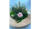 Teaková miska v kombinaci se stabilizovaným mechem, rostlinami a květinami ve speciální úpravě za použití oleje a vosku v luxusním provedení.