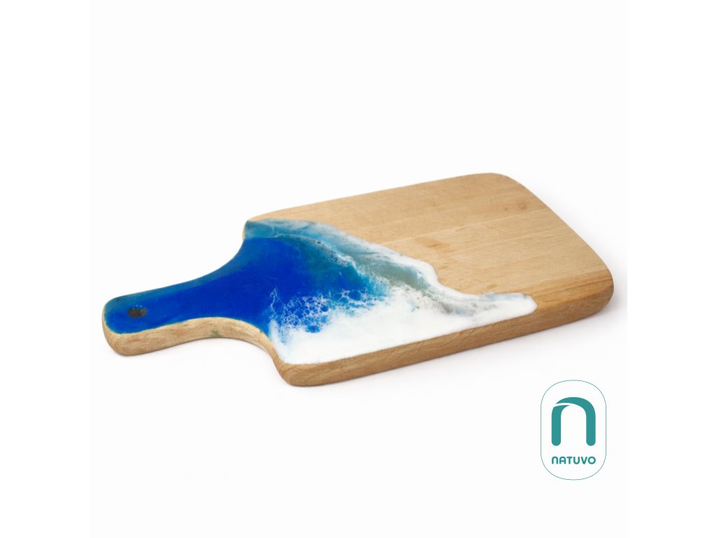 Představ si pohled z útesu na moře s vlnami. Přesně ten pocit ti navodí naše okrasná dřevěná deska s modrým epoxidem, která vlní jako hluboký oceán přímo ve tvé kuchyni.