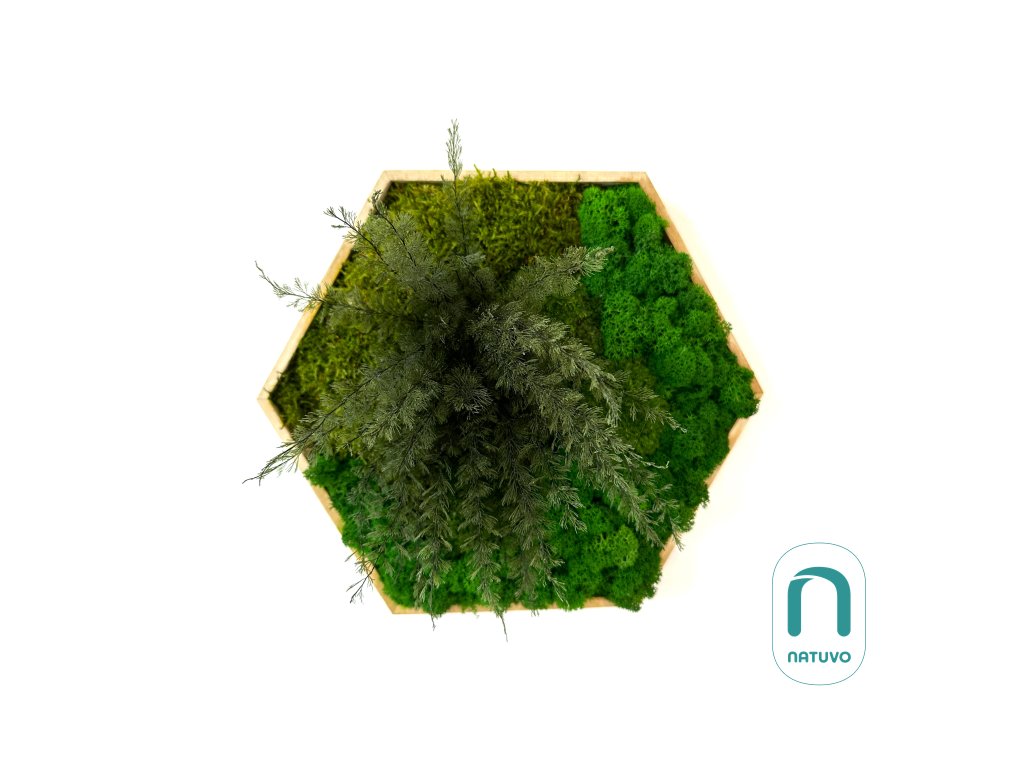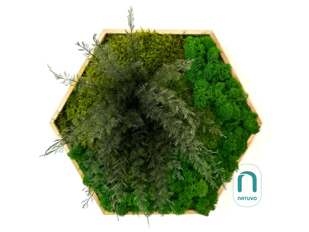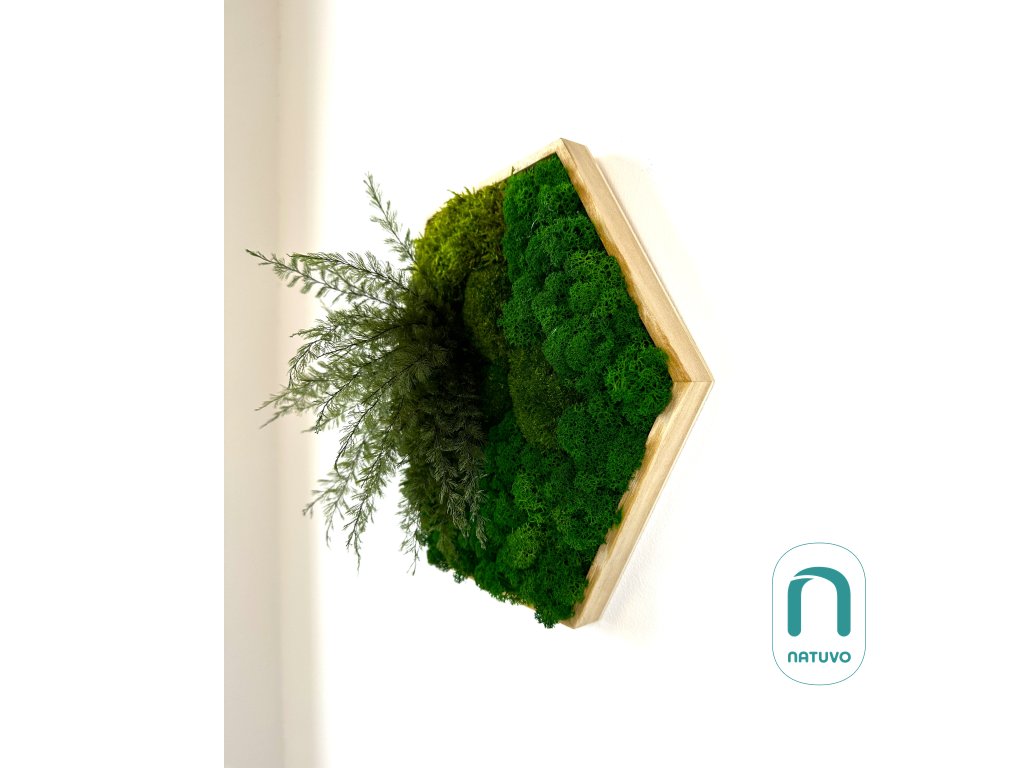 Hexagon Lisa je ručně vyráběný designový kousek, který spojuje krásu přírody s moderním stylem. V dřevěném šestiúhelníkovém rámu se nachází harmonická kombinace stabilizovaného lišejníku a jemné kapradiny, které si uchovávají svůj svěží vzhled bez potřeby polévání či světla.