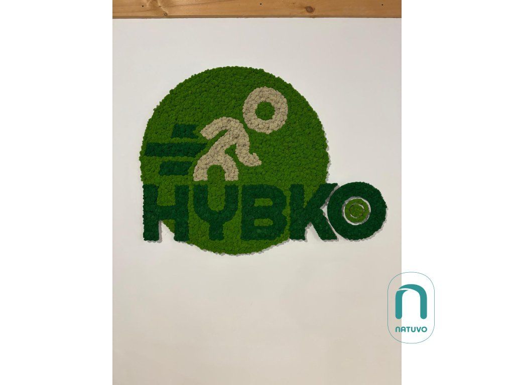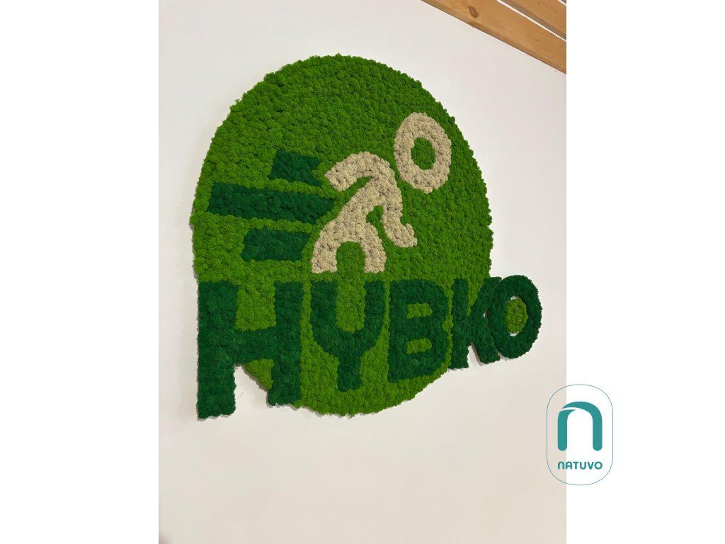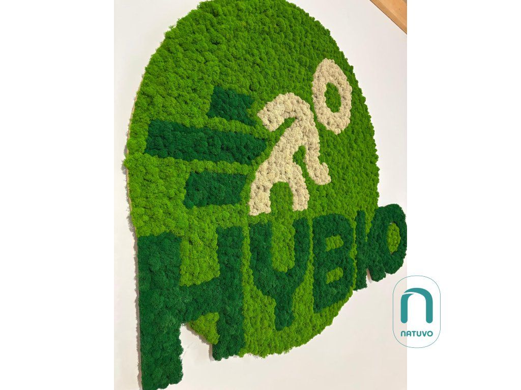 Na fotografii můžete vidět logo, kde má kruh průměr 100 cm a z něj vycházejí písmena. Podkladem je deska, na kterou se lepí mech. Postavička je ze stabilizovaného mechu v přírodní barvě, nápis je v jablkově zelené a největší plochu tvoří hrášková barva.