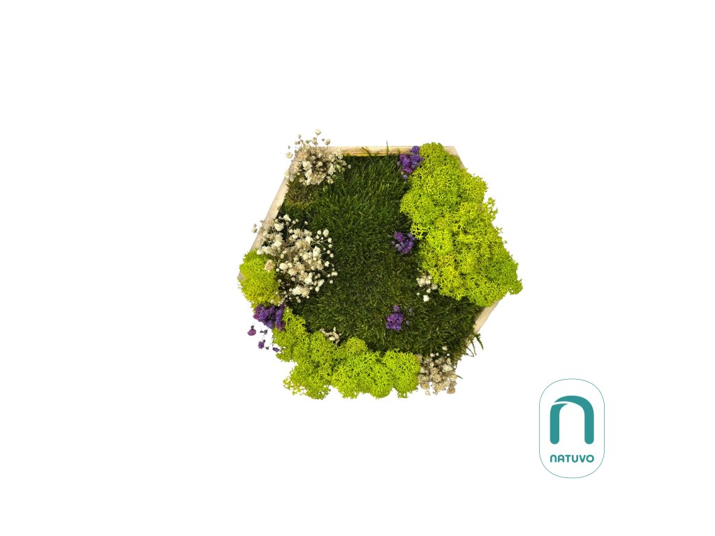 Mechový hexagon Ela – spojuje krásu přírody s nadčasovým designem. Tento unikátní obraz je vyroben z ručně aranžovaného stabilizovaného plochého mechu, lišejníku a doplněn sušenými květy, které mu dodávají jemnost a romantický nádech.