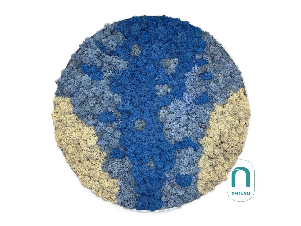 Tento kruh je vytvořen ze stabilizovaného lišejníku v kombinaci natural, světlemodré a tmavomodré barvy. Tmavomodrý lišejník je aranžován tak, aby připomínal korál, což dekoraci dodává přírodní a originální vzhled inspirovaný mořem. Hodí se k ozdobení obývacího pokoje, ložnice či kanceláře, kde navodí pocit klidu a blízkosti přírody.
