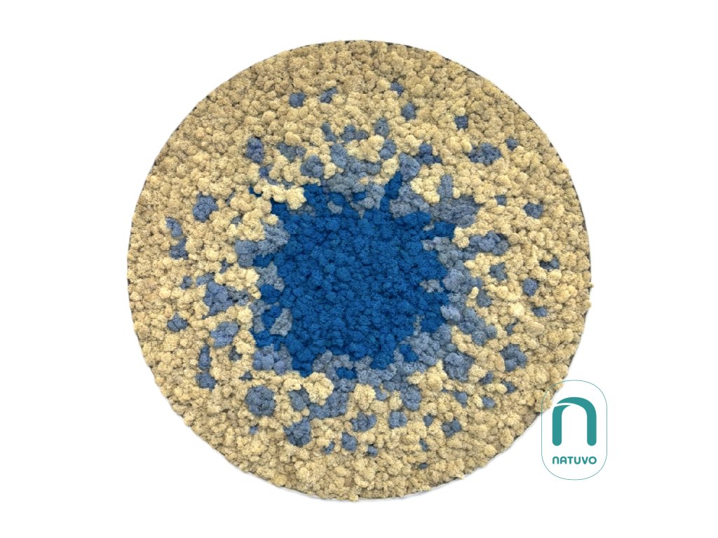 Tento kruh z přírodního stabilizovaného lišejníku kombinuje jemné natural odstíny s kontrastem světlemodrého a tmavomodrého lišejníku, který evokuje slunce. Dekorace je ručně vyrobená, každý detail je pečlivě umístěn, aby vznikl harmonický a zároveň výrazný vizuální efekt. Kruh se hodí na zeď v obývacím pokoji, ložnici či kanceláři a přináší pocit klidu a spojení s přírodou.