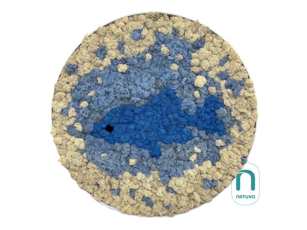 Tento kruh z natural stabilizovaného lišejníku kombinuje světlemodré a tmavomodré odstíny, které vytvářejí hravý motiv bublinky a rybičky. Každý detail je ručně umístěn, aby vznikl harmonický a originální design. Dekorace se hodí do obývacího pokoje, dětského pokoje nebo kanceláře a přináší hravý a svěží akcent do prostoru.