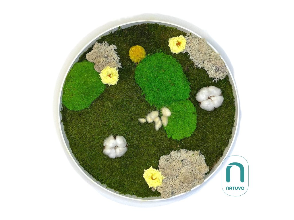 Obraz se stabilizovaným mechem, stabilizovanými rostlinami a květinami je výjimečným uměleckým dílem a zároveň dekoračním prvkem, který kombinuje různé stabilizované přírodní materiály. Stabilizovaný mech, stabilizované rostliny a květiny jsou materiály, které prošly procesem stabilizace, aby si zachovaly svůj původní vzhled a strukturu, a proto je není nutné zalévat ani jinak udržovat.