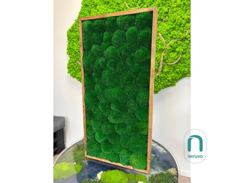 Mechový obraz z kopečkového mechu je velmi vkusný doplněk interiéru. Působí v místnosti 3D, moderně, nadčasově a přinese do interiéru pozitivní atmosféru.