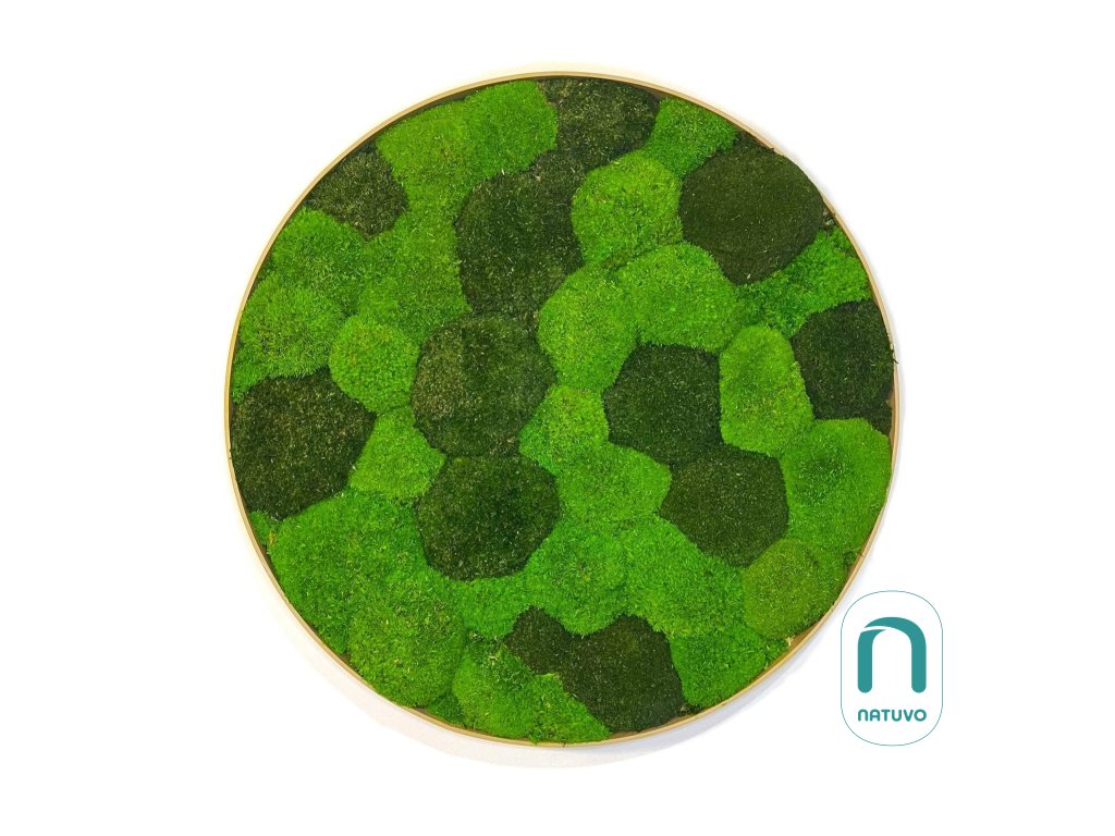 Mechový obraz kruh v kombinaci se stabilizovaným kopečkovým mechem je velmi vkusný doplněk interiéru. Působí v místnosti moderně, nadčasově a vnese do interiéru pozitivní atmosféru.