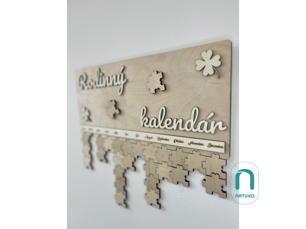 Tento originální dřevěný rodinný kalendář je nejen praktický, ale i stylová dekorace do každé domácnosti. Slouží k přehlednému zaznamenání narozenin, svátků a výročí. Každý měsíc má svou řadu, pod kterou zavěsíte puzzle dílky se jmény a daty.