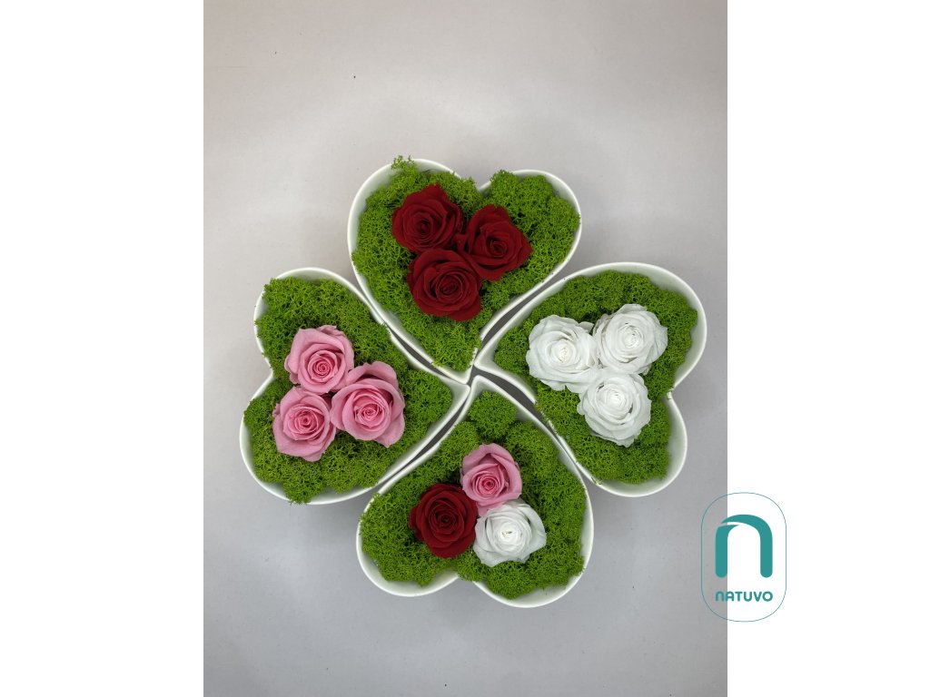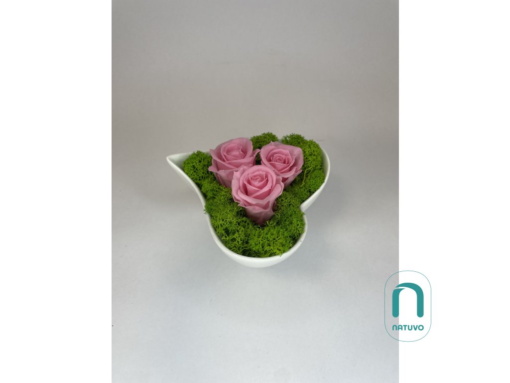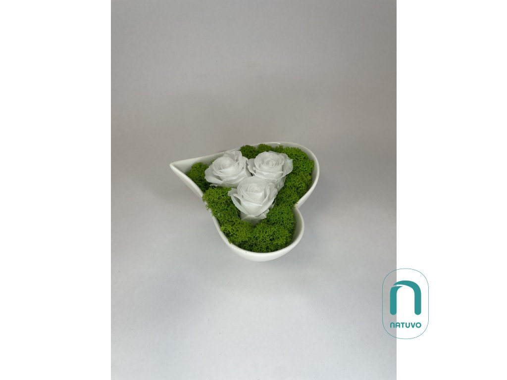 Působí v místnosti moderně, nadčasově a vnese do interiéru pozitivní atmosféru. Nabízíme jej o velikosti 12 cm x 12 cm x 6 cm v bílém porcelánovém květináči ve tvaru srdce se stabilizovanými růžemi a stabilizovaným lišejníkem.