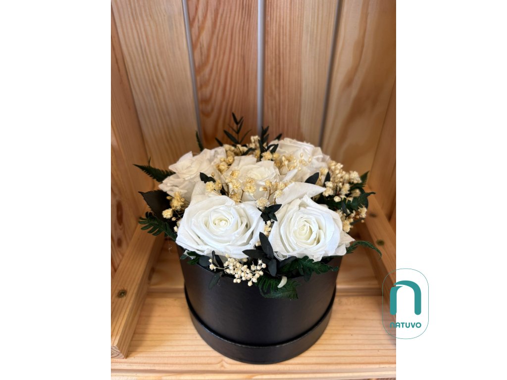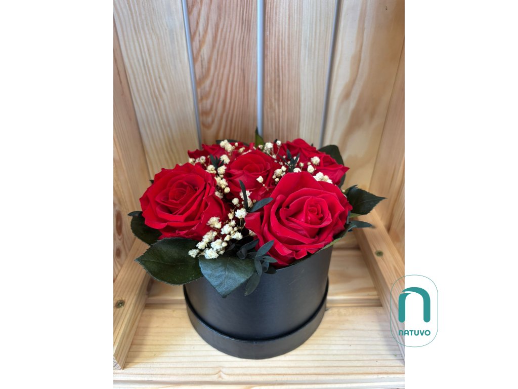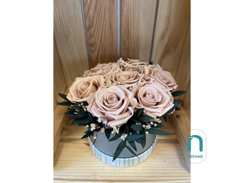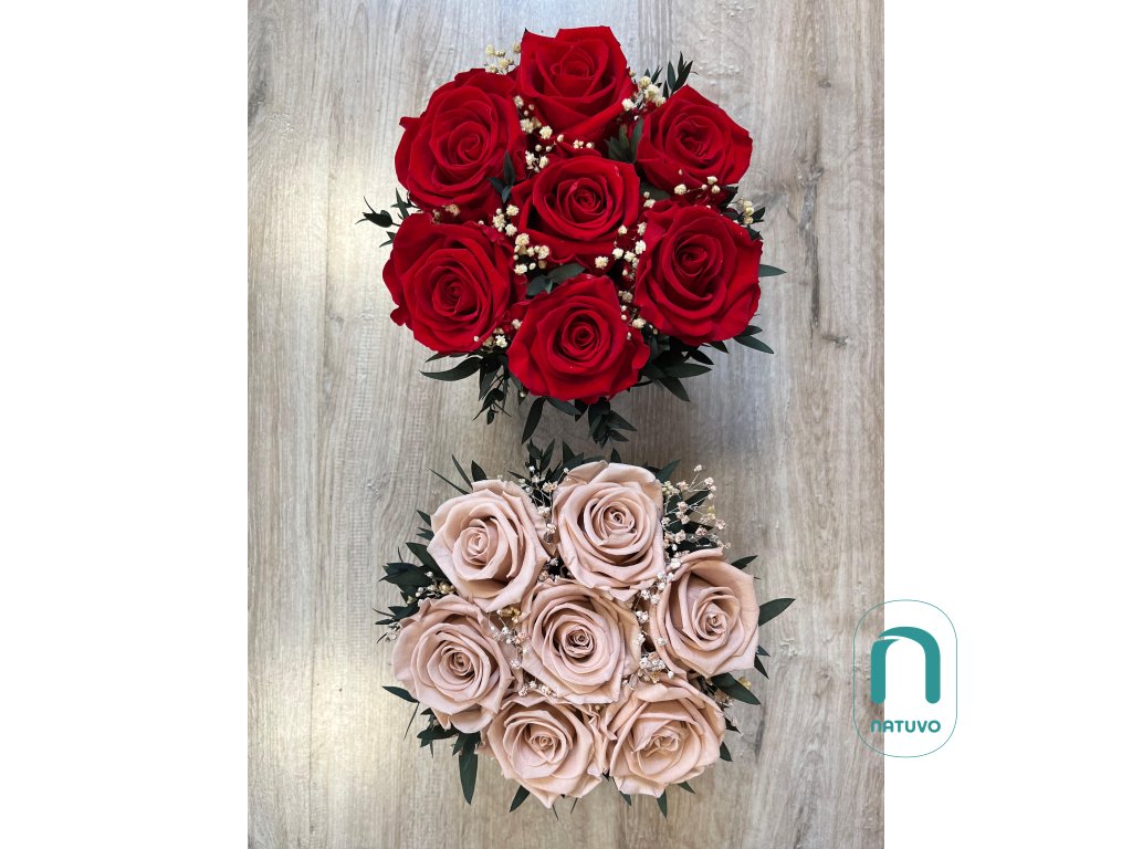 Kytice Florenelle je něžná a výrazná zároveň – ideální volba pro ty, kdo hledají spojení přírodní krásy a dlouhé trvanlivosti. Toto elegantní aranžmá je umístěno v pevném ozdobném boxu a tvoří jej 5 nebo 7 stabilizovaných růží, doplněných o tmavě zelené listy a jemné stabilizované květiny.