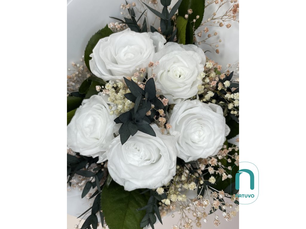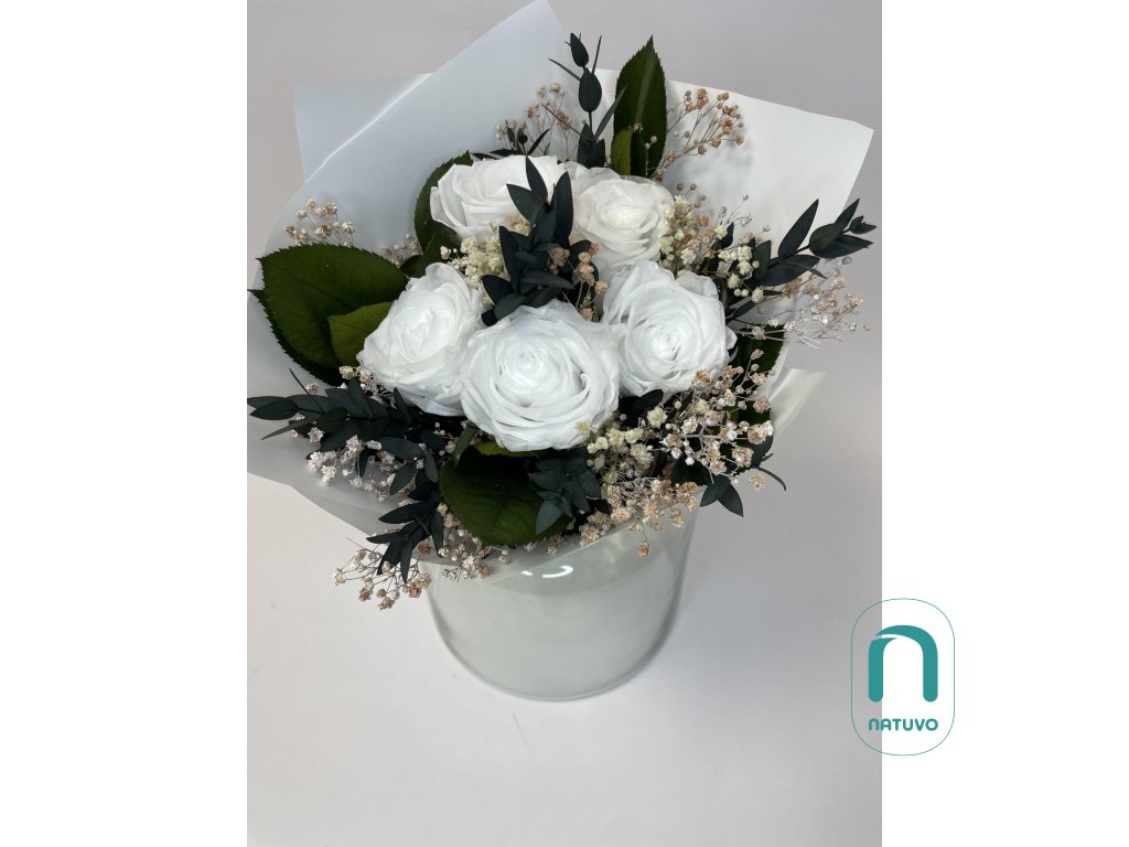 Stabilizovaná kytice Livena působí jemně, svěže a čistě. V jejím základě jsou bílé stabilizované růže doplněny přírodními prvky a zelení, které dodávají kytici vzdušnost a harmonii. Díky své jednoduchosti se hodí do každého interiéru a pro různé příležitosti – od svatební výzdoby po dárek k výročí či narození dítěte.