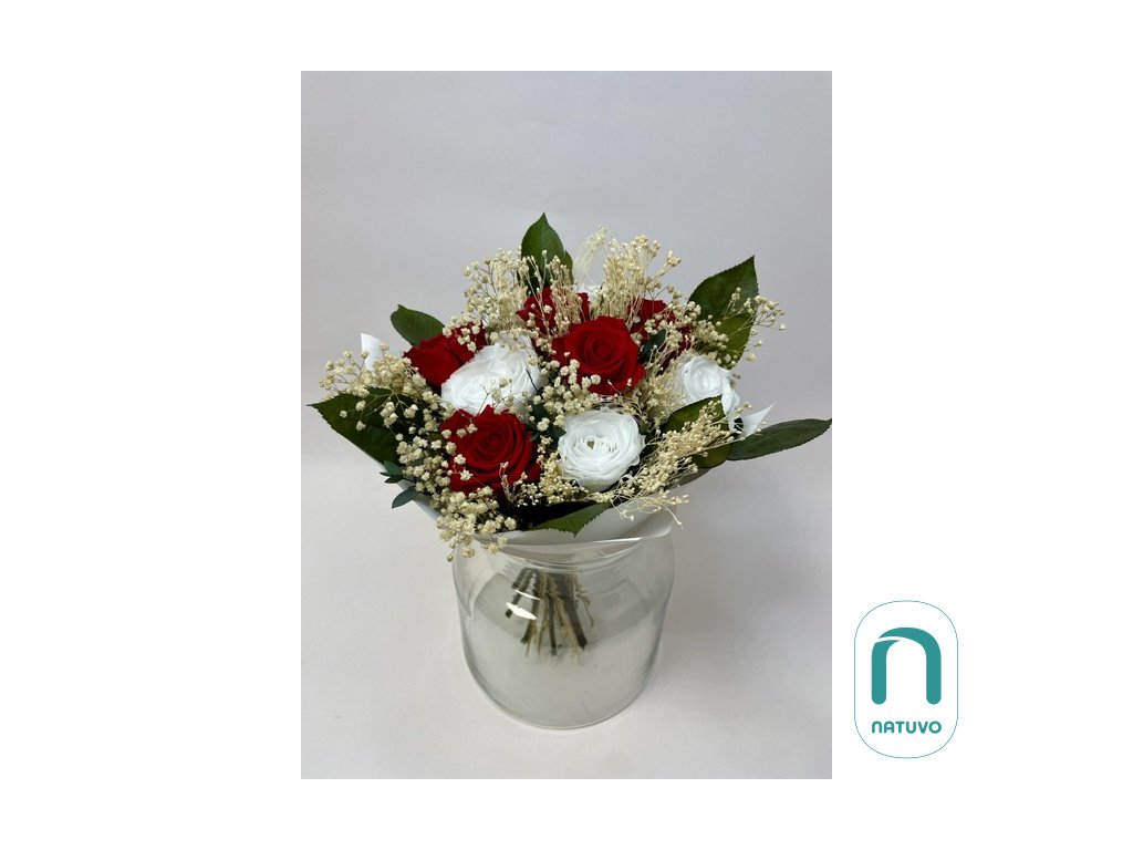 Kytice Ravea je ztělesněním rovnováhy. Červené a bílé stabilizované růže dohromady vytvářejí klasickou a nadčasovou kombinaci, kterou doplňují přírodní a sušené prvky. Každý detail je pečlivě ručně vyskládaný, aby působil harmonicky a zároveň působivě.
