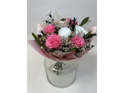 Stabilizovaná kytice Selari je něžná a hravá. Oslava ženskosti v bílo-růžových tónech. Můžete si ji vyskládat ze 3 až 10 růží a pokud byste ji chtěli čistě...