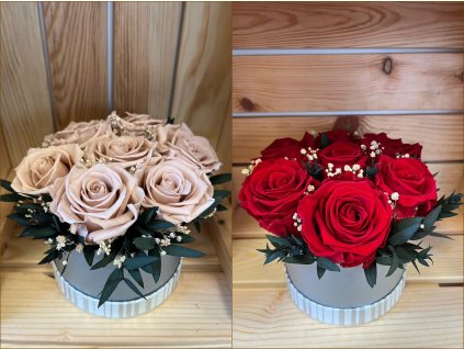 Elegantní kytice Florenelle v luxusním boxu je dostupná v červené nebo starorůžové barvě. Stabilizované růže, které zůstanou krásné celá léta.