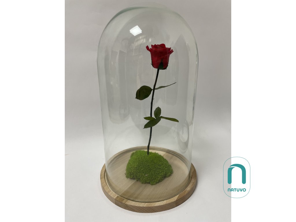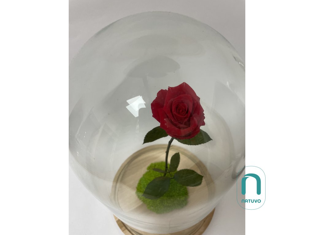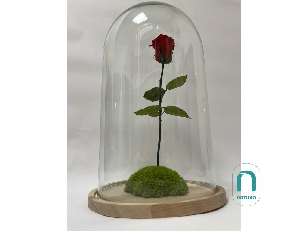 V srdci kopule stojí jediná, ale o to výraznější červená růže – je stabilizovaná, aby si zachovala svou krásu a čerstvost i několik let. Jemný stabilizovaný mech na dřevěné podložce dotváří harmonický kontrast barev a působí jako zelený ostrůvek života.
