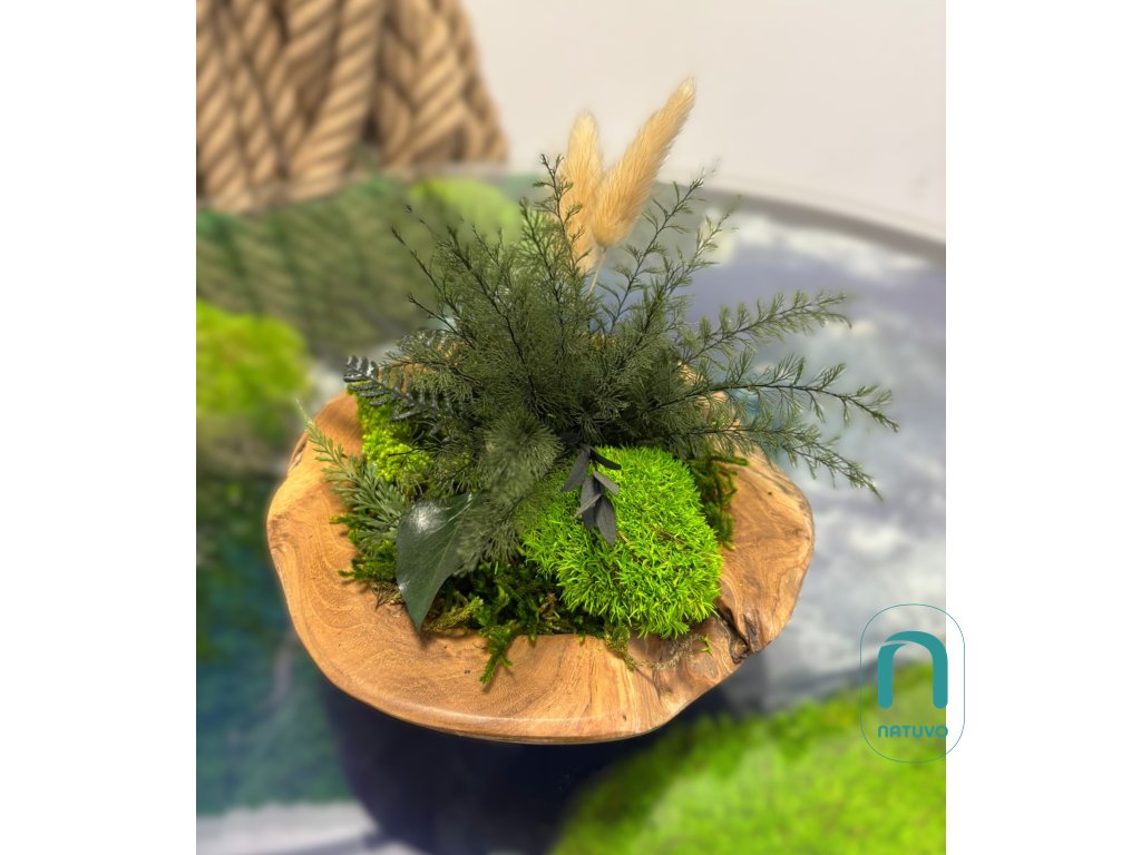 Mechová stolní dekorace v teakové misce v kombinaci se stabilizovaným mechem, rostlinami a květinami je velmi vkusným doplňkem interiéru. Díky němu vypadá místnost moderně, nadčasově a vnáší do interiéru pozitivní atmosféru.